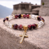Εκλεπτυσμένο γυναικείο βραχιόλι με μωβ, πολυγωνικές χάντρες και χρυσές λεπτομέρειες από ανοξείδωτο ατσάλι. Στο κέντρο βρίσκεται λευκός σταυρός που προσθέτει πνευματικό συμβολισμό και διακριτική κομψότητα. Ιδανική επιλογή για στυλάτες εμφανίσεις με νόημα.